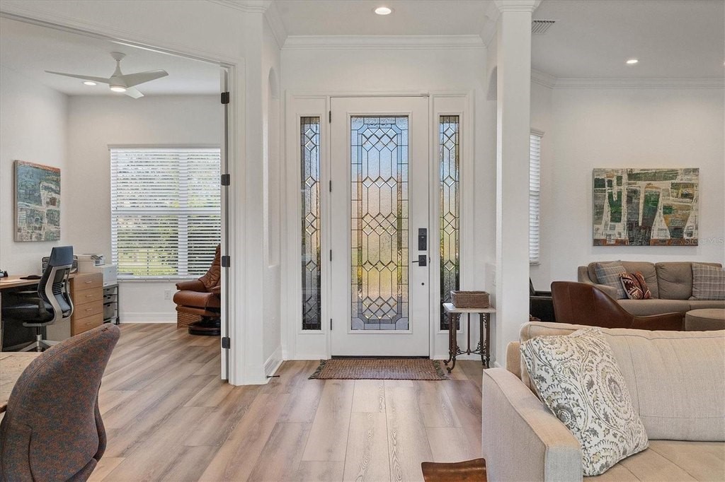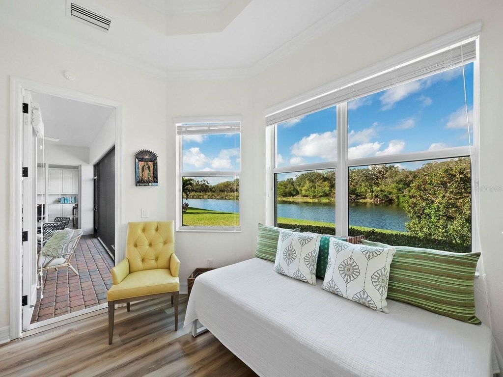 Enjoy the beauty of Sarasota living in this elegant, impeccably maintained four-bedroom, two-and-a-half-bath home with 2,359 square feet of thoughtfully designed living space in the sought-after gated community of Laurel Lakes. From the moment you enter, expansive sliding glass doors frame breathtaking, uninterrupted views of the spring-fed lake and natural landscape beyond. Watch birds and wildlife from almost every room in your home with no neighbors in sight behind you—just peaceful water and lush scenery. Built in 2015, this sophisticated, move-in-ready home is a rare find! One of the newest homes in the neighborhood, it showcases enduring quality with a barrel tile roof, paver driveway, crown molding, and a spacious three-car garage—two bays of which are newly air-conditioned and fully insulated creating a flexible space that can serve as a fitness room, art studio, workshop, playroom, or entertainment center, complete with a deluxe motorized retractable screen for fresh air or privacy. Inside, you’ll find NEW luxury vinyl plank flooring, high tray ceilings, and an abundance of natural light that accentuates the open, bright floor plan. The lanai is equipped with a NEW 23’ panoramic screen and motorized sunshade, seamlessly blending indoor and outdoor living. And with over one-third of an acre, the backyard is large enough to easily expand the lanai or add a custom pool. The chef’s eat-in kitchen is a true showpiece, featuring solid wood cabinetry, granite countertops, breakfast bar, and NEW smart appliances: including sound-dampening Bosch dishwasher, Consumer Reports’ highest-rated natural gas cooktop, and four-door Bespoke refrigerator with Flex freezer. The primary suite offers peaceful lake views, lanai access, a tray ceiling, and a spa-inspired bath with dual sinks, walk-in closet, soaking tub, and glass-enclosed shower. NEW ELFA closet systems are installed throughout the home, providing exceptional organization and functionality. Additional features include a NEW top-of-the-line Carrier Infinity high-efficiency A/C system, hurricane shutters, whole-house surge protection, low HOA fees, no CDD, and a location outside the flood zone for peace of mind. Residents of Laurel Lakes enjoy resort-style amenities including a clubhouse, fitness center, pool, tennis and pickleball courts, basketball, and the UNIQUE ability to kayak on the community’s spring-fed lakes. Ideally located near Sarasota’s top-rated schools – including A-rated Tatum Ridge Elementary – prime shopping, dining, world-class beaches, UTC, Lakewood Ranch, and the Sarasota Airport. With $125,000 of high-end upgrades, this home blends modern comfort, timeless design, and natural beauty in one of Sarasota’s most desirable gated communities.
